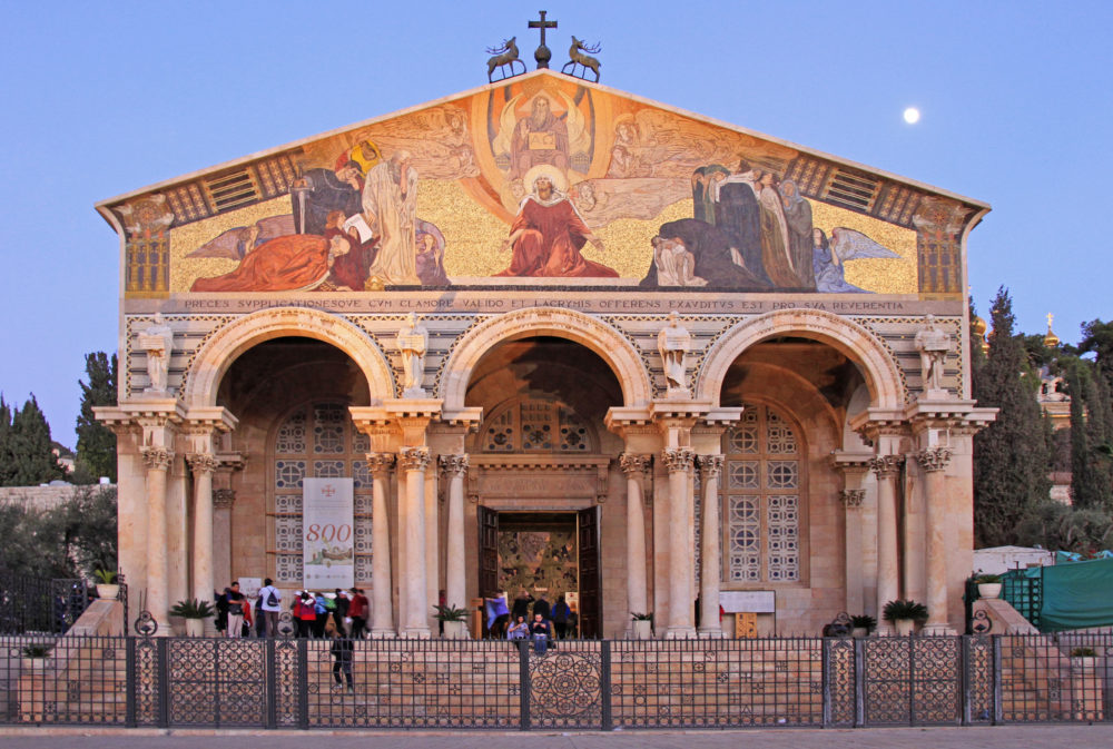 The Church of All Nations Posted on September 23, 2019February 24, 2020 by tofra Designed by Italian architect Antonio Berluzzi, the Church of All Nations was built in the 1920’s. It is located on the Mt. of Olives, on the site of the Garden of Gethsemane, and is one of the main churches dominating the panorama of the mount. The funds for constructing the church were donated by many nations, which is where the name of the church originated. However in 1922, it was officially consecrated as the Basilica of the Agony. The church was built over the slab of bedrock, on which it is said that Jesus spent his last night in agonizing prayer, sweating blood. The stone is in the middle of the present church, in front of the altar. The church was built on the site of two previous chapels that had been destroyed – a 12th century Crusader chapel that was abandoned, and a 4th century Byzantine church that was destroyed in an earthquake, the remnants of which, including a magnificent mosaic floor and pillar, were found during the digging works for laying the foundations of the present church. The architect had the excavations of this church completed, and the results can be seen under a glass floor from inside the church building. The donations for the church came from many nations – Australia, Argentina, Brazil, Belgium, Chile, Canada, Germany, Hungary, Ireland, Mexico, Poland, Spain and the United States of America. Each nation is represented by a coat of arms on the ceiling in a separate dome. The church is separated into three aisles by six violet colored alabaster columns, while the ceiling is painted blue and dotted with stars, depicting the night sky. The somber colors and semi-darkness present in the church are made to represent the somber and tragic atmosphere surrounding the last night of Jesus before his arrest. The neoclassical appearance of the church derives from the Corinthian style columns that support the front atop which are statues of the four evangelists, as well as the magnificent mosaic adorning the façade. The church itself is made of two types of stone. The interior stone was quarried just north of Jerusalem, whereas the exterior rose colored stone came from Bethlehem. The Church of All Nations is a Roman Catholic Church, currently entrusted to the Franciscan Custody of the Holy Land. In the gardens there is an outside altar which is used by many Christian denominations, including Roman Catholic, such as Eastern Orthodox, Armenian Apostolic, Protestant Lutheran, Evangelical, Anglican, and any other version of Christianity that is culturally unique to any particular nation.
