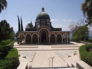 View of Mt.of Beatitudes where Jesus preached the Sermon on the Mount overlooking the Sea of Galilee.