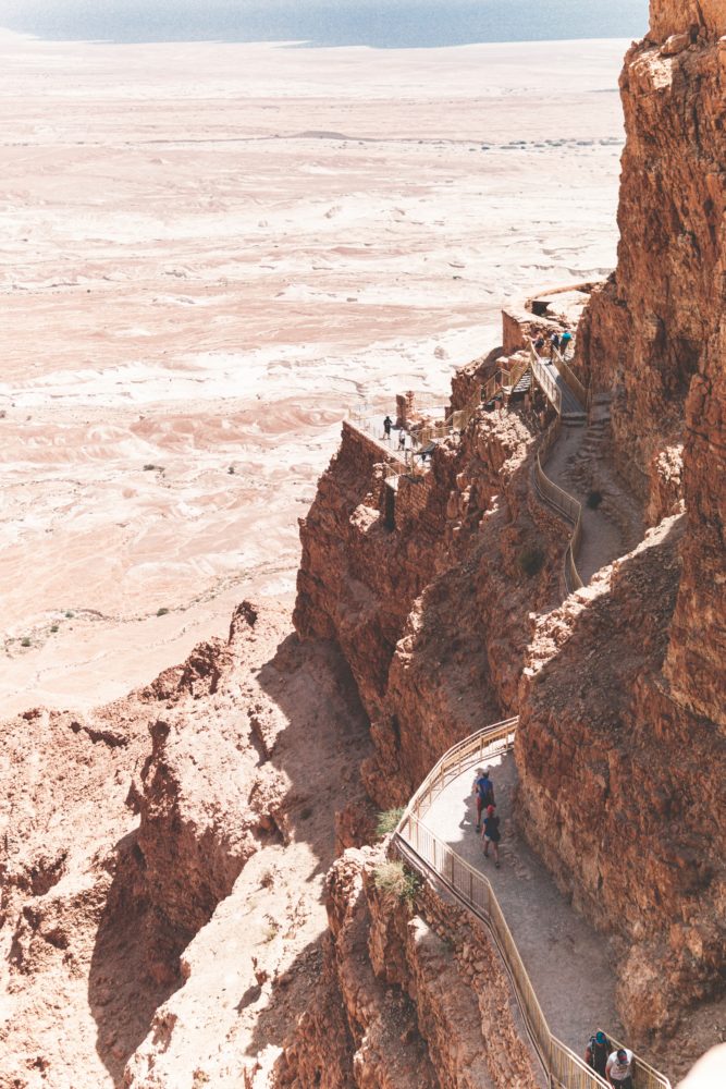 Masada is a fortress built into a mountain, towering high above the Dead Sea. How high, you ask? Masada’s plateau is 60m (196 ft.) above sea level – about 490m (1,509 ft.) above the surface of the Dead Sea. You can either take the cable car to the peak, hike up the Snake Path from the eastern side, or take the Roman siege ramp on the western side.